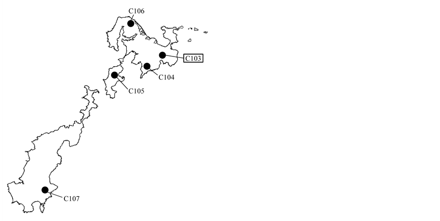 During our fieldwork, we investigated 257 locations throughout West Kyushu, excluding the Tsushima Islands, that were suitable for the growth of C. incana (Nagasaki Mainland = 146; Goto Islands = 80; Koshikijima = 31). As a result, we confirmed 37 natural populations (Table 1): 16 populations in the Nagasaki Mainland, 16 populations in the Goto Islands, and 5 populations in the Koshikijima Islands were confirmed (Figures 2(a)-(c)). The average altitude of these locations was 24.9 ± 3.8 (mean ± S.D.) m for the Tsushima Islands [18] , 175.3 ± 26.9 m in Nagasaki Mainland, 35.75 ± 7.77 m for the Goto Islands, and 123.8 ± 22.0 m for the Koshikijima Islands. On Iki Island, Nagasaki, we were not able to confirm the natural population according to Itow and Kawasato [16] . Among the survey areas, 6 populations were distributed along the shore of the Goto Islands, and several populations were confirmed in the environment near villages, including the open rocky sites along the roadside, like the Tsushima Islands. The populations in the southern part of the Goto Islands tended to include fewer individuals within a population; the populations in the northern part tended to include more individuals within a population. However, the populations in the Nagasaki Mainland, except one population along the shore, were located in the inland and particularly limited to high altitudes. In the Nagasaki Mainland, the populations near Nagasaki City tended to include fewer individuals than populations on Hirado Island of northwestern Nagasaki. In eastern Nagasaki, and on the eastern side of the neighborhood of Saga, no natural populations were confirmed in the environment suitable for the growth of C. incana. On the Koshikijima Islands, there were fewer numbers of populations than other areas; only one population was confirmed on the south island of the Koshikijima Islands. There were many individuals in one population (C107) on the south island of the Koshikijima Islands, but the populations on the north and center island tended to include fewer individuals. In addition, one population (C106), which included many individuals on the north island of the Koshikijima Islands, was located near the green slope faces along the roadside, and it is possible that those were affected by human activities. The populations in West Kyushu tended to have fewer individuals and population densities than the populations on the Tsushima Islands, thus isolated populations which had fewer opportunities to exchange genes with other populations were presumed to have lower fitness due to inbreeding or Allee effect [24] -[26] .