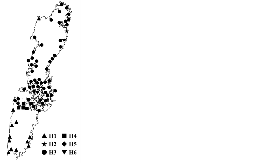 The geographical distribution for each haplotype of chloroplast DNA sequences in the study areas are shown in Figure 3. In each area, five haplotypes were located on the Tsushima Islands [18] (Figure 3(a)). Two haplotypes were mainly separated between the southern part and the northern part of the Tsushima Islands, and several haplotypes were located in the center part and the north island. Six haplotypes were located in the Nagasaki Mainland (Figure 3(b)). Nine haplotypes were located on the Goto Islands (Figure 3(c)). Three haplotypes were located on the Koshikijima Islands (Figure 3(d)).