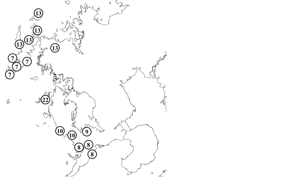 Figure 3. (a). Geographic distribution of chloroplast DNA haplotypes detected on the Tsushima Islands [18] . (b). Geographic distribution of chloroplast DNA haplotypes detected in the Nagasaki Mainland. Circle labels indicate chloroplast DNA haplotypes corresponding to Table 2. (c). Geographic distribution of chloroplast DNA haplotypes detected on the Goto Islands. Circle labels indicate chloroplast DNA haplotypes corresponding to Table 2. (d). Geographic distribution of chloroplast DNA haplotypes detected on the Koshikijima Islands. Circle labels indicate chloroplast DNA haplotypes corresponding to Table 2.