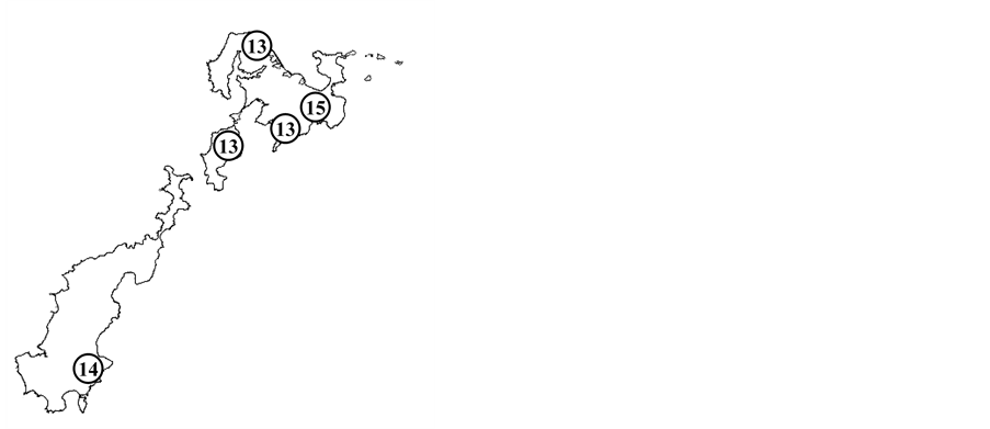 Figure 2. (a). Geographic distribution of Caryopteris incana on the Nagasaki Mainland. Black circles indicate each population. Numbers label different populations. Boxed labels indicate populations reported by Itow and Kawasato [16] . (b). Geographic distribution of Caryopteris incana in Goto Islands. Black circles indicate each population. Numbers label different populations. Boxed labels indicate populations reported by Itow and Kawasato [16] . (c). Geographic distribution of Caryopteris incana on the Koshikijima Islands. Black circles indicate each population. Numbers label different populations. Boxed labels indicate populations reported by Itow and Kawasato [16] .