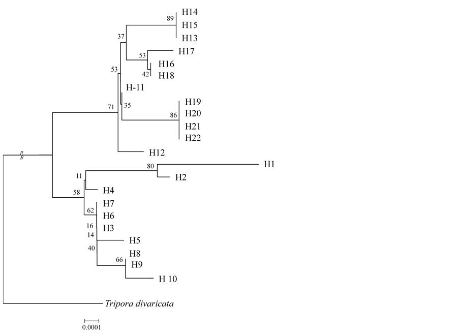 Figure 4. Neighbor-joining tree of chloroplast DNA haplotypes based on the sequences of six non-coding regions in Caryopteris incana. Numbers below the branches indicate the bootstrap values. Scale bar indicates the number of nucleotide substitutions per site.