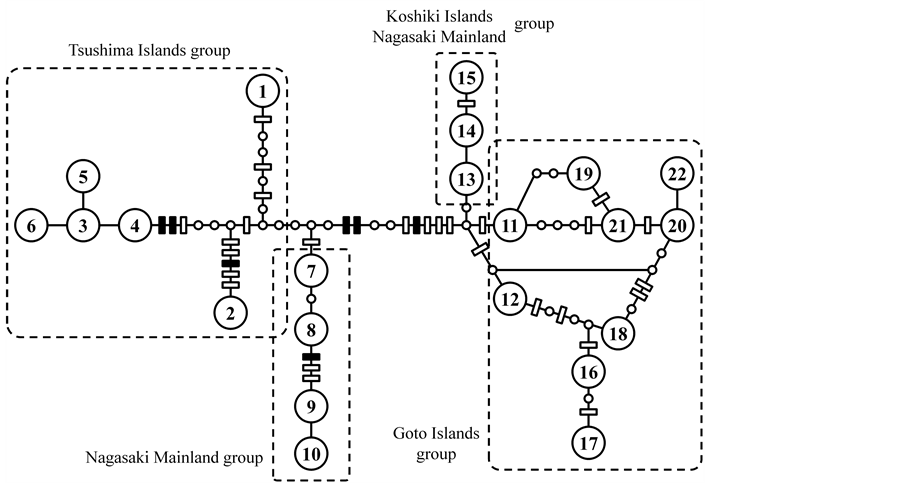 The family tree consisted of 22 haplotypes from 109 natural populations in West Kyushu, and is shown in Figure 4. These haplotypes were mainly classified into two groups. The lower group on the family tree was designated from H1 to H10. These haplotypes were distributed on the Tsushima Islands and the Nagasaki Mainland. The upper group on the family tree was designated from H11 to H22. These haplotypes were distributed on the Goto Islands, Koshikijima Islands, and the Nagasaki Mainland. The haplotype network that included the indels of base sequences, and the number of repetitions along with the substitutions, is showed in Figure 5. The haplotype network almost reflected the geographical distribution of haplotypes.