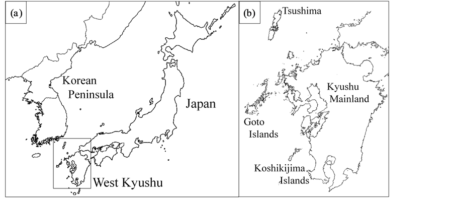 Figure 1. Map showing the location of the study area. (a) Geographical location of West Kyusyu, Japan. (b) Outline of West Kyusyu.