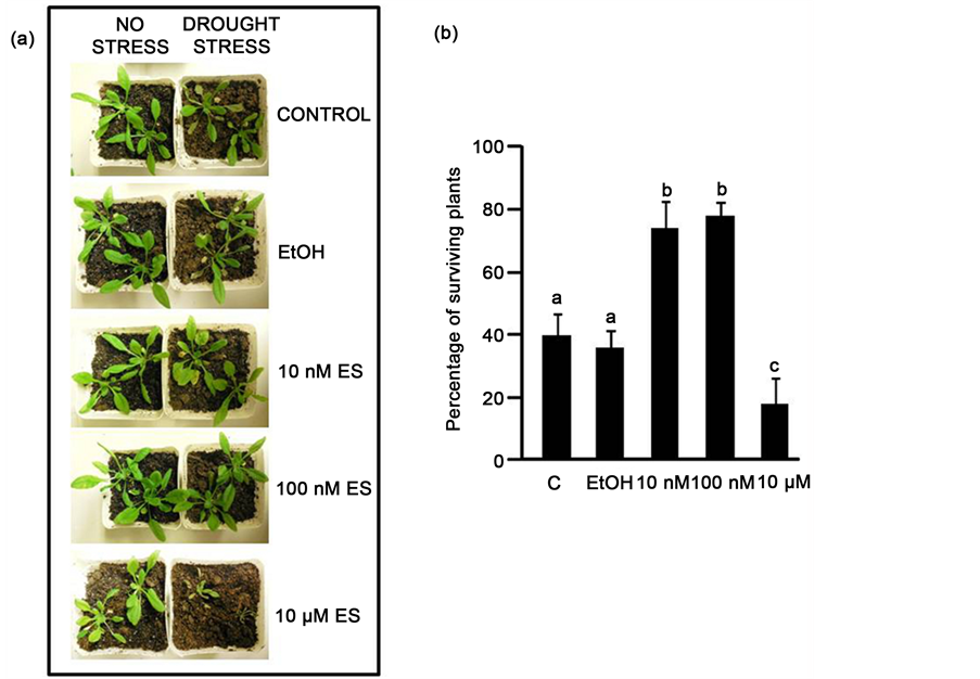 After seven days of induced drought by withholding irrigation, both ES-treated and control plants developed characteristic drought stress symptoms of wilting, chlorosis and tissue senescence, although the 10 nM and 100 nM ES-treated plants showed relatively less symptoms (Figure 1(a)). At the end of the recovery week, during which the watering schedule was resumed, it was observed that the 10 and 100 nM ES-treated plants coped better than controls and 10 µM ES-treated plants with the induced drought conditions in terms of tissue senescence and chlorosis. Significantly higher tolerance to drought stress was observed in 10 and 100 nM ES-treated plants with 74% and 78% of the plants surviving, respectively, as compared to 40% surviving regularly watered control plants and to 36% surviving EtOH control plants. The lowest tolerance to drought stress was recorded for 10 µM ES-treated plants with an 18% survival rate (Figure 1(b)).