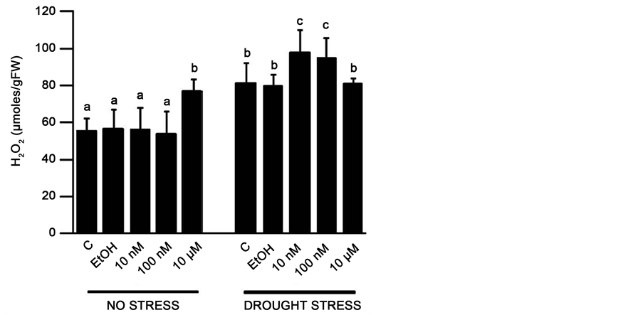 H2O2 can scavenge high energy electrons generated during abiotic stresses and thus protect plant cells, however high levels of H2O2 can contribute towards oxidative stress [22] . It was observed that, under no-stress conditions, the Arabidopsis plants treated with 10 µM ES accumulated significantly higher levels of H2O2, a 38% increase from the levels found in the controls and the other ES treatments. The levels of H2O2 in control and 10 and 100 nM ES-treated plants under no stress were not significantly different indicating that ES treatment is responsible for the high concentration of H2O2 in the 10 µM ES treated plants (Figure 3). Under induced drought stress, H2O2 concentration in 10 µM ES treated plants was no different than in no stressed plants and no significant different than the levels in drought-stressed control plants. With approximately 23% increase in H2O2 levels as compared to the non ES-treated controls, plants treated with 10 and 100 nM ES accumulated the highest levels of H2O2 under drought conditions (Figure 3).