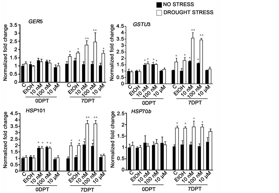 Real time-PCR was performed to assess the expression levels of four stress responsive genes that are involved in providing plant cells protection during drought conditions. Enhanced expression of GLUTATHIONE S-TRANSFERASEU3 (GSTU3), GEM-RELATED5 (GER5), HEAT SHOCK PROTEIN101 (HSP101) and HSP70b was observed 7 days post drought stress (Figure 5). The expression of GSTU3 was approximately 3.5 fold higher in the leaves of drought-stressed 10 and 100 nM ES-treated plants than in those of non-stressed control plants. Expression levels of GER5 in drought-stressed 10 and 100 nM ES-treated plants was determined to be approximately 3.6 folds higher than in the control plants. The application of 10 and 100 nM ES, under
