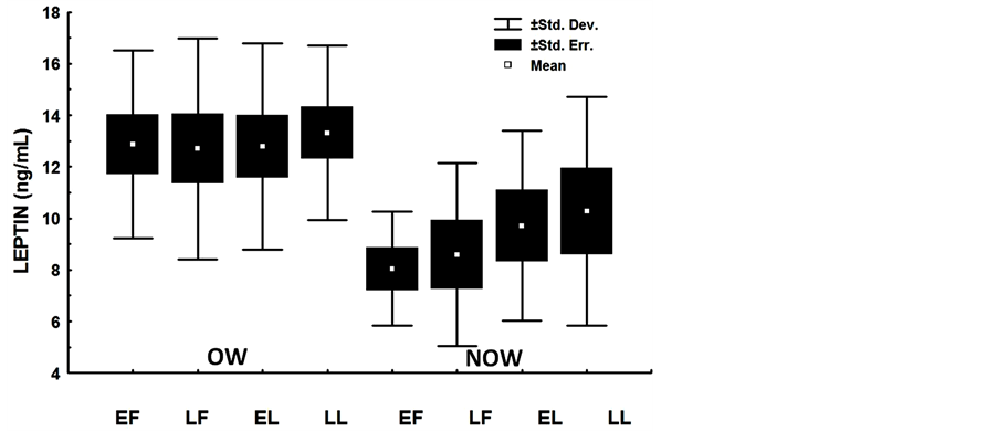 In OW and NOW, SHBG serum levels were lower in LF than in the other phases of the menstrual cycle. Figure 1 shows the leptin serum levels in ng/mL for OW and NOW in the four phases of the menstrual cycle: 12.32 ± 3.6, 12.4 ± 3.6, 12.7 ± 4.0, 13.3 ± 3.2 (for OW) vs. 7.42 ± 2.3, 7.74 ± 3.8, 8.54 ± 3.31, 8.5 ± 3.7 (for NOW), F = 2.7, p = 0.02, (EF, LF, EL and LL, respectively).