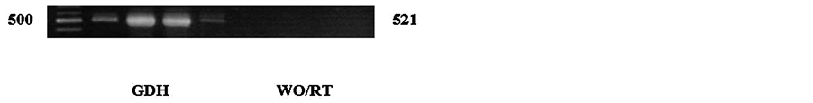 Figure 2(a) shows a representative gel electrophoresis (patient IV), upon which we based our conclusions of presence of absence of the transcript using densitometry. Lanes 2 - 5 of 2.A contain for L-mRNA transcript isolated from samples taken during the EF, LF, EL and LL, respectively, and lanes 6 - 9 represent the assay for the OB-R mRNA receptor across these phases, respectively. Note that these data are recapitulated in row IV of Table 4 along the results of all of the gel electrophoresis analyses. Figure 2(b) shows our positive and negative controls, lanes 2 - 5 and 6 - 9, respectively. GDH corresponds to Glycerol-3-Phosphate-Dehydrogenase (GDH) mRNA (lanes 2 - 5) and samples WO/RT shows the results without reverse transcriptase (lanes 6 - 9).