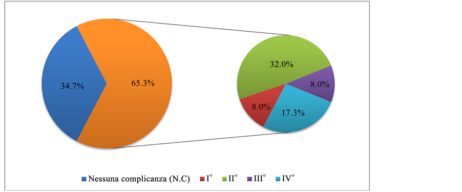 Results similar to ours were obtained in Ju-Hee Lee et al. study [4] , with an overall complication rate of 65.4%, (25.3% in patients undergoing laparoscopy and 40.1 in patients undergoing laparotomy). This higher complication rate is closely related to the precise application of the definition of complication as “any deviation from normal postoperative course”: for example, asymptomatic fever or transient anomalies in laboratory tests are classified as Grade I and II complications, in spite of their conservative treatment. This type of complications represented the most part of the complications which were observed in both the Ju-Hee Lee’s and our studies.
