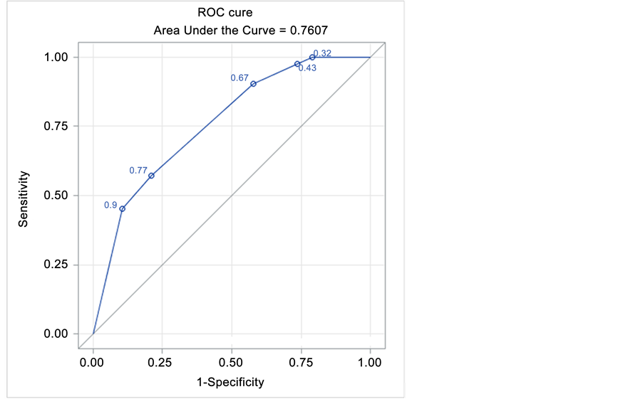 regression model, significant factors were: the laparoscopic technique (OR = 0.050; 95% CI = 0.005 - 0.550, p = 0.0143) and no transfusions (OR = 0.219; 95% CI = 0.058 - 0.827, p = 0.0251), which were found to reduce post-operative complications (Table 5). The area under the ROC curve (Figure 2) for these factors is 76%: it shows that the significant factors which were found can quite well identify post-operative complicated patients. In Figure 3 we can see the expected probability to develop a post-operative complication based on identified factors: when a patient undergoing open technique and received pre-operative or intra-operative transfusions, the probability to have a post-operative complication is 90%, conversely, in patients undergoing laparoscopy and without transfusions, the probability falls to 1%.