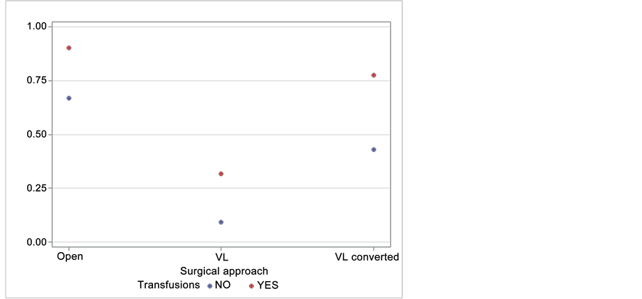 Figure 3. Complications probability considering transfusions and surgical approach.
