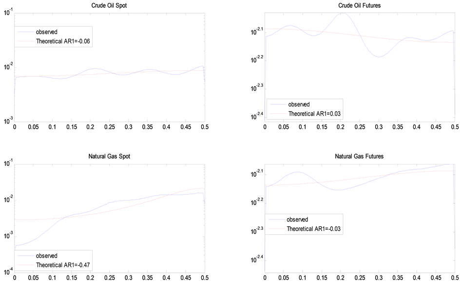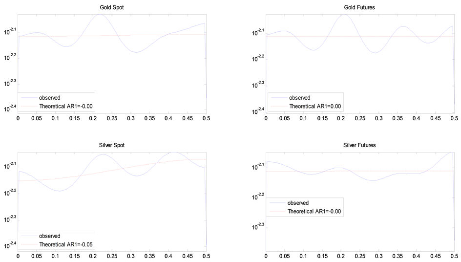 The statistical significance of wavelet power spectrum of the observed time series can be assessed relative to the null hypothesis that the signal generating the process is stationary. Since the series in this study cannot be said to be stationary at level, stationarity is induced by log-differencing. This transformation ensures that the observed time series is normal and can be modeled as a Gaussian AR (1) process. It is assumed that null hypothesis for power spectrum is normally distributed as AR (1) process. This assumption affects the acceptance of null hypothesis for the power spectrum of each time series or for the co-spectrum of any two time series as well as their coherence. The color of the noise on the other hand is important for both the spectrum and the co-spectrum while the wavelet coherence is insensitive to the choice of the color. Appendix 1 shows that red noise is an appropriate background to test against the theoretical AR (1) spectrum for the power decay closely matching the observed spectrum. The following simple AR (1) model will serve to illustrate the difference between white and red noise