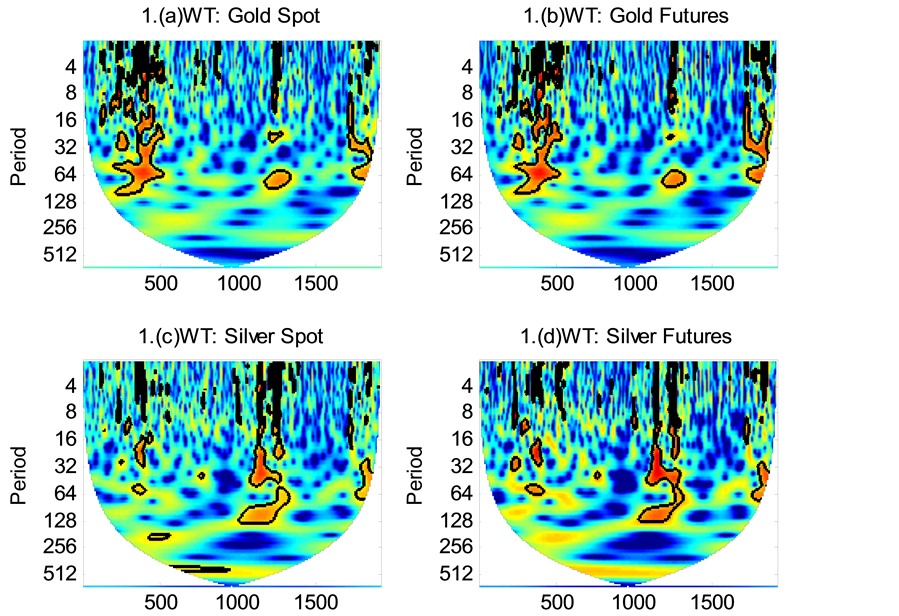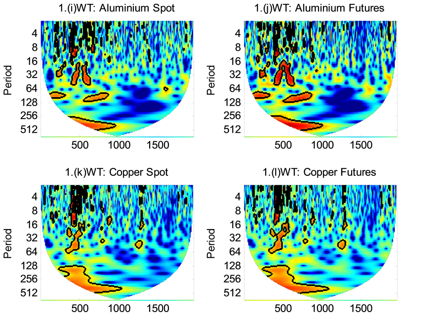 commodities examined. Time is shown on the x-axis, while the y-axis refers to frequency; the lower the frequency, the higher the scale. The convex curve stretching from the left margin to the right margin is the cone of influence, where the area beyond which is statistically insignificant.