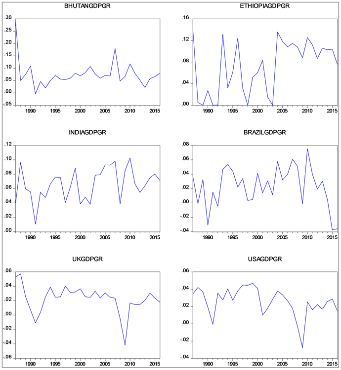 In this paper, the authors have tried to evaluate the causality and stable long-run linear relationship between GDP growth rate (GDPGR) and FDI over a period of thirty years using econometric tests for six countries, namely, Bhutan, Ethiopia, India, Brazil, USA and UK. Of the selected countries, Bhutan and Ethiopia represent the underdeveloped; India and Brazil represent the developing and USA and UK represent the developed economies. This categorization is important because the current study also seeks to verify the general impression of FDIs being more critical for the growth of the underdeveloped and developing economies as compared to the developed economies.