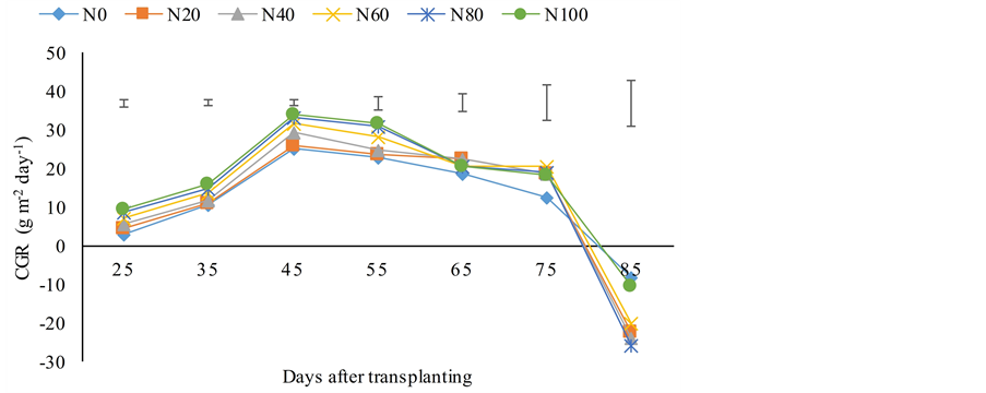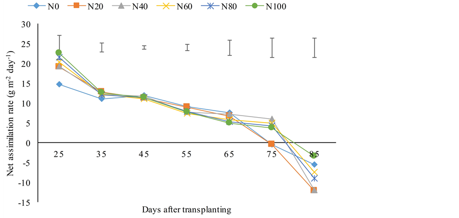 The trend of crop growth rate under different doses of nitrogen fertilizer illustrated that, crop growth rate of the variety was slow at early growth stage which became peaked at flowering stage and again declined towards maturity stage and showed even negative values (Figure 4). Nevertheless, the lowest crop growth rate (−25.96 g m−2∙day−1) was recorded at 85 days after transplanting when crop was fertilized with 100 kg N ha−1. Contrary, the highest crop growth rate (33.99 g∙m−2∙day−1) was obtained when the crop was fertilized with 100 kg N ha−1 at 45 days after transplanting. Crop growth rate was slower at the earlier stage of the variety. Slow crop growth rate at earlier stages of the rice variety might be due to lower leaf development which act as a main organ of photosynthesis on which growth rate depends [25] . The phenomena of crop growth rate tend to be low again during later stage and negative towards maturity considerably due to several reasons. These are 1) excessive leaf senescence after reproductive stage diminishing photosynthesis rate [21] [23] , 2) upkeep of respiration burden increases over time which hinge on biomass and particularly its N content [26] , 3) ineptitude of the plants to maintain post floral N uptake [27] [28] or cannot store significant N reserves in other organs excepting leaves