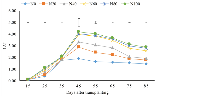 Figure 1. Changes in leaf area index (LAI) of new rice variety due to nitrogen levels over the crop growth.