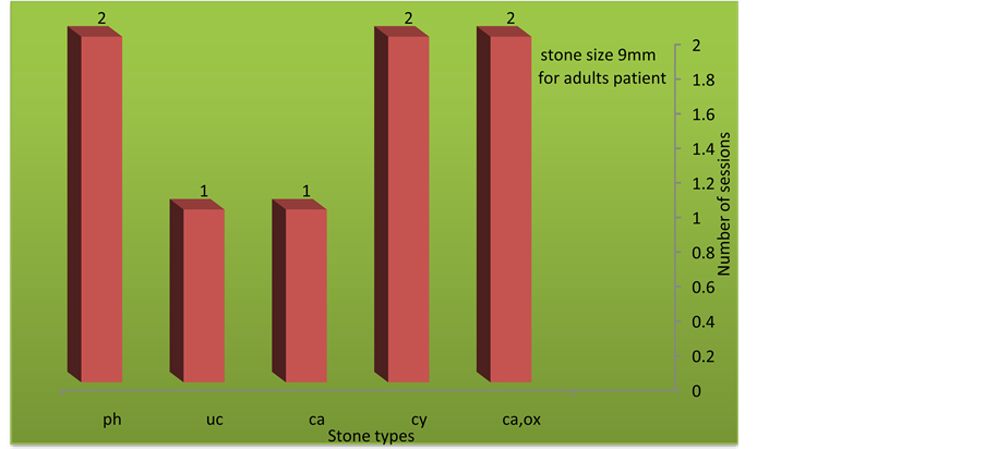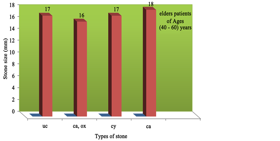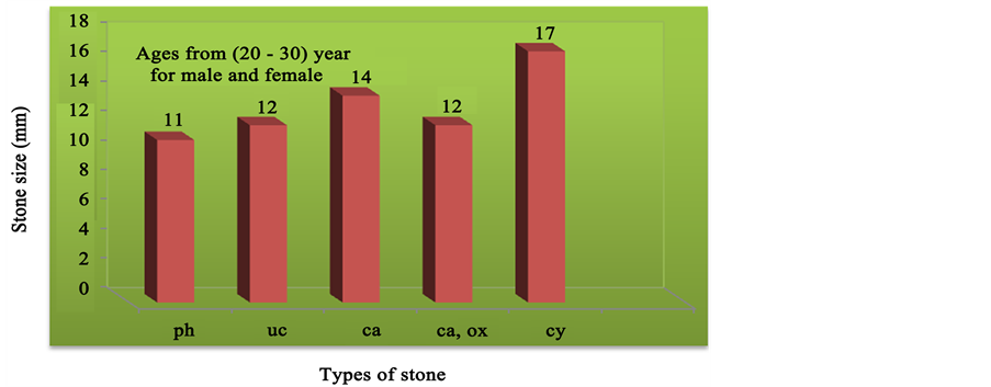 On the other hand stones size for adult’s patients of ages 20 to 30 years as a function of stones compositions is shown in Figure 4. It is clear from figure that the minimum stones size is obtained for phosphate compositions and maximum value for cystine stones due to its hardness. The present result is well agreement with previous work reported by [23] , introduced the concept of stone fragility on ESWL, based on the composition of the stone. Cystine and brushite calculi are the most resistant to ESWL, followed by calcium oxalate monohydrate, struvite, calcium oxalate dihydrate, and uric acid stones. Stone composition affects the resistance to fragmentation and the type of fragments produced. Cystine and calcium oxalate monohydrate tend to produce large pieces that are difficult to clear from the collecting system, and they should be treated by ESWL only when the stone burden is small (i.e., <1.5 cm). As well as Figure 5 show similar diagrams for elder patients aged 40 to 60 years old.