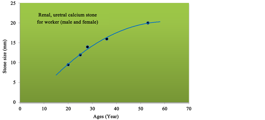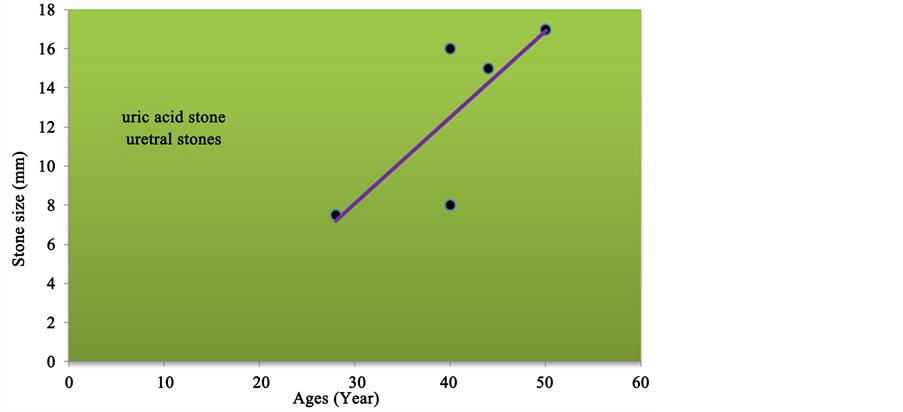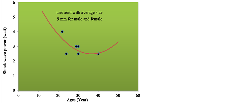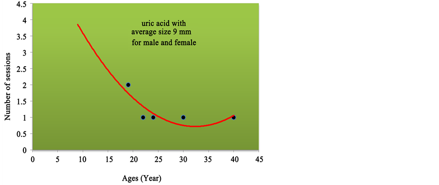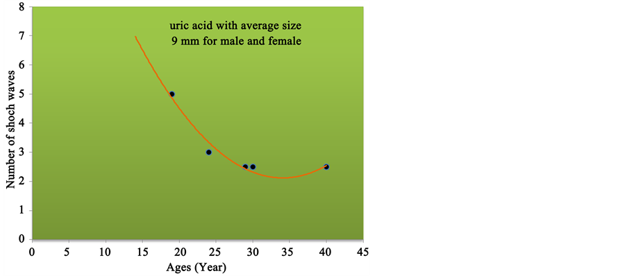 ESWL is very easy and useful method of treatment, and as such a first method of choice in the treatment of kidney stones, less invasive than all other methods, with 80% - 90% treatment success. Once we localized place of the calculus, lithotripter breaks the same for thousands of shock waves with an emphasis on regional focal area, which leads to its decomposition into pieces. After treatment, the fragments are removed by urine during the following months [12] . Size of stone, its position and localization as well as ages of patients and sometimes patients’ region are prognostic factors that determine the level of disintegration of stone after using ESWL in pediatric patients. According to the analysis of [13] , ESWL should be recommended for renal pylon stones up to 24 mm for the upper or middle calyx to 15 mm, and lower calyx to 11 mm. Although the composition of stone is independent variable that can be useful for predicting the success of ESWL, for most stones is difficult to predict the sensitivity of breaking by the X-ray prior to ESWL. European treatment guidelines advise active ESWL treatment for all stones larger than 6 - 7 mm [14] . Factors known to alter the extracorporeal lithotripsy outcome are: stone size, location, chemistry, number as well as patient anatomy. Stones larger than 15 mm and calcium oxalate monohydrate stones usually require several ESWL procedures for clearance. Uric acid, calcium oxalate dehydrates as well as struvite stones are much easier to be disintegrated. ESWL has poor results for stones located in the lower calyx (“stone free” rate of 41% - 70%) [15] - [18] . Calculi between 10 - 20 mm are still largely treated with ESWL as the first line management. [19] . However; stone composition and location do have an impact on the results of ESWL for stones in this size range and should be carefully considered. As well as patient's ages and sometimes patient’s region on the outcome of ESWL. Furthermore attempt has been done to study the physical relations between these parameters after treatment with this technique. Figure 2 represents an increasing relation between uretral uric acid stones size and patient’s ages male and female contrary to the previous result obtained by [20] , because there is a positive relation between them [21] .