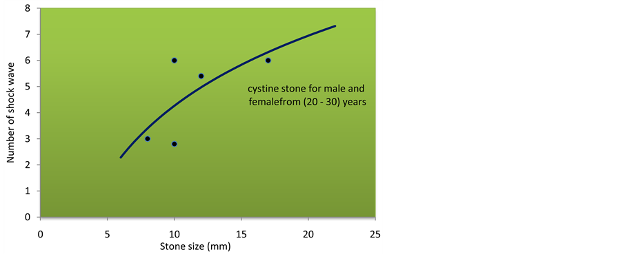Number of shock wave session versus patient’s ages reveal also negative correlation between them as illustrated in Figure 7 because the stone fragmentation and its removal after ESWL is easier in elders than in adults and starts earlier. Unlike adults due to the small sizes of the body of the elders compared to the adult’s body, this probably depends on reaching the stone with less energy loss of the shock waves. Because the distance between the skin and stone in elders is shorter, the shock waves are less absorbed by the surrounding tissue and organs and they reached the stone with less energy loss and their therapeutic effect relatively becomes more. While passing through the body tissue of elders which is thickness is less than the adults, the shock waves have been reported to lose less of their energies [27] . Due to the same reason the shock wave power needed to fragment the elder’s stones is less than adult’s stones as illustrated in Figure 8. With respect to the number of shock wave variation with stones size, our results for renal and uretral cystine stones, for ages 20 to 30 years indicated positive variation between stones size and number of shock wave (Figure 9).