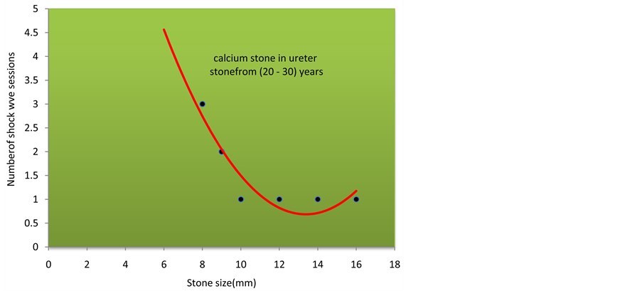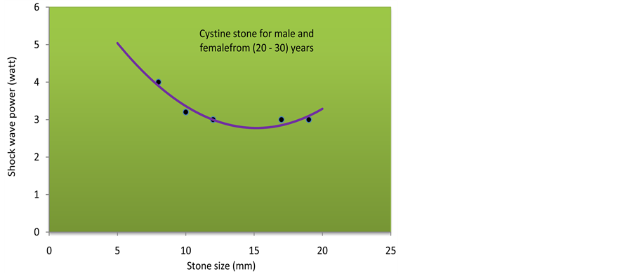This is well agreement with the previous research which is predicted a significant positive correlation between the size stone and number of treatments in the total sample (rho = 0.491, p < 0.01), respectively, as the stones were larger was needed and a higher number of treatments [28] . On the other hand, number of sessions and power of shock wave as a function of calcium and cysteine stones size respectively for patients’ ages from 20 to 30 years are plotted in a nearly decreasing exponential (Figure 10 and Figure 11).