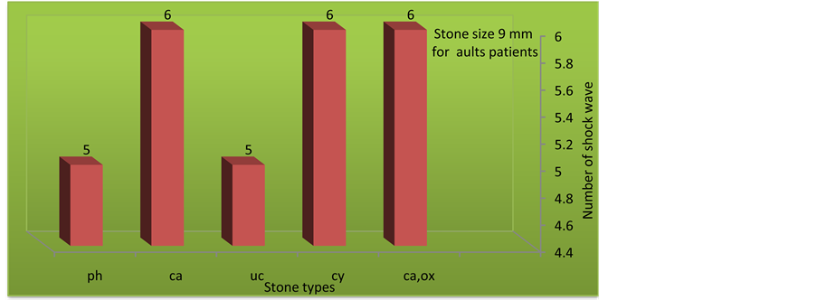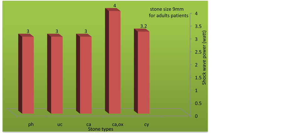 The interesting results are presented by [29] , who proved an inverse correlation between the performance of ESWL and size of the stone. As part of their study, the authors demonstrated that the stones of high density, large size and lower localization in the kidney can better administered in a method PCNL (Percutaneous nephrolytopaxy). Later the number of shock wave, shock sessions and its power against stones composition are plotted in Figures 12-14. As illustrated from figures that the phosphate and uric acid need less treatment of ESWL to fragment the stones, while cystine and calcium stones required more treatment of ESWL to fragment due to hardness of a latter stones as indicated by previous research, composition can meaningfully affect the result of ESWL. Uric acid and stone calcium oxalate dihydrath as better fragmentation coefficient compared to calcium oxalate monohydrate and cystine stones [30] .