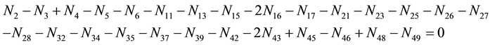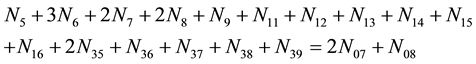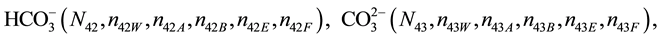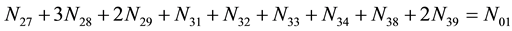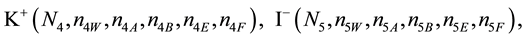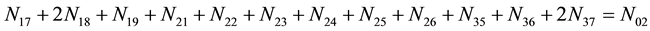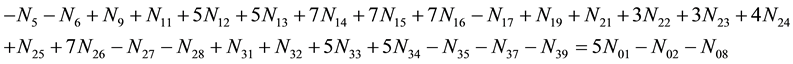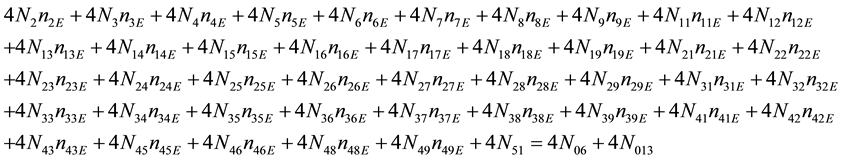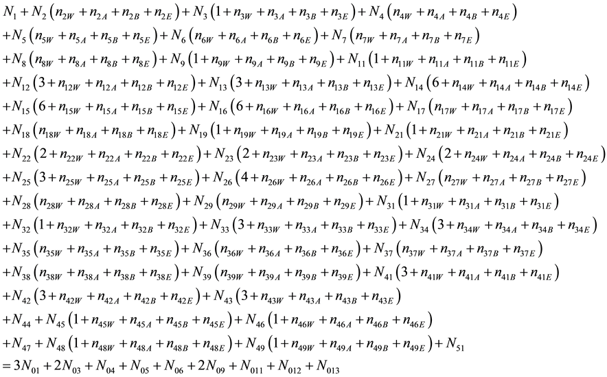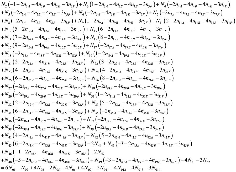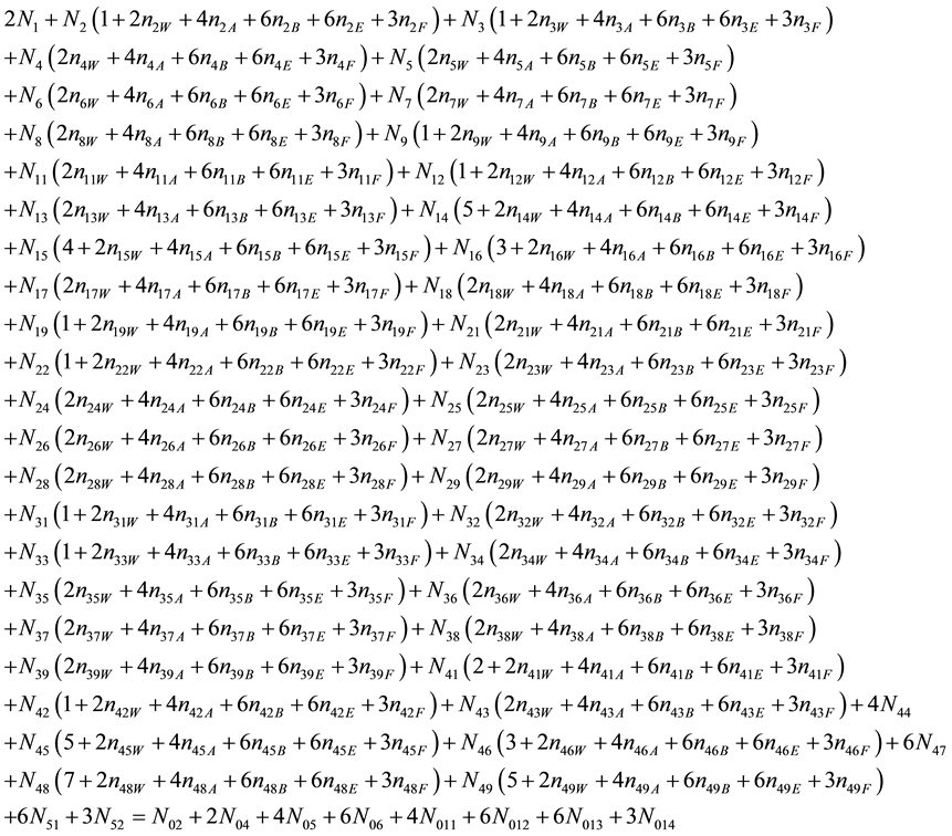 As we see, Equation (3) does not involve the terms N1, N04, and {niW} related to water. To cancel the terms involved with A, B, E and F, we add Equation (3) to the core balances (4) - (7): 2・f(CH3O) (4), 4・f(C2H5O) (5), 4・f((CH3)2SO) (6), 3・f(CH3CN) (7) and charge balance (8). Further simplification gives addition of the balance for K (9), and of the core balance 4・f(CO3) (10):