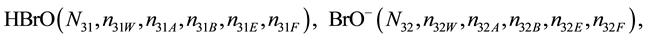 Let us consider a system obtained after addition of V mL of titrant (T) containing I2 (C) + KI (C1) + CO2 (C2) in A + B + E + F into V0 mL of titrand (D) containing KBrO3 (C0) + HCl (C01) + CO2 (C02) in W + A + E; all concentrations are expressed in mol/L. The volume V0 mL of D is composed of N01 molecules of KBrO3, N02 molecules of HCl, N03 molecules of CO2, N04 molecules of W, N05 molecules of A, and N06 molecules of E; V mL of T is composed of N07 molecules of I2, N08 molecules of KI, N09 molecules of CO2 and N011 molecules of A, N012 molecules of B, N013 molecules of E, and N014 molecules of F.