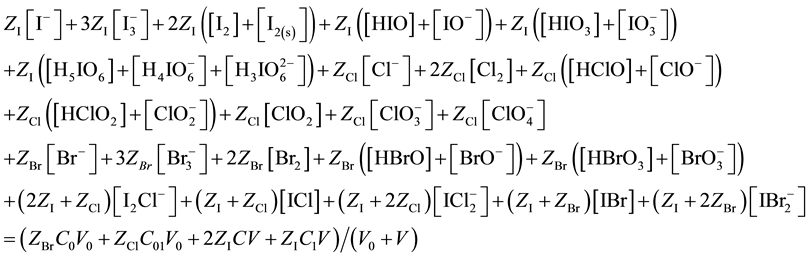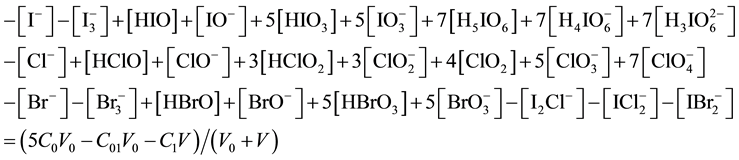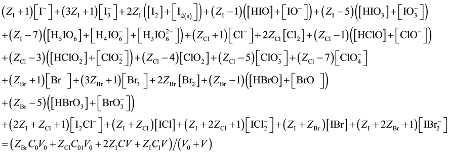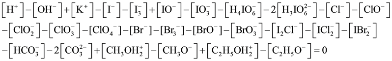 One can notice that uncharged (neutral) species: I2, I2(s), Cl2, Br2, ICl, IBr are not present in Equation (13). Note also that Cl−, Br−, I−, Cl2, Br2, I2, I2(s),
