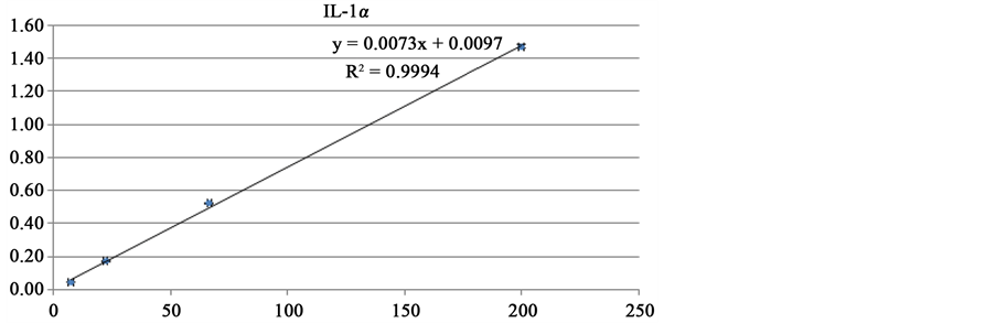 Standard curve were calculated from DO readings at 450 nm and known protein concentration (pg/ml) (Figure 1(a)). Then, production of IL-1α data were calculated for each of the treatment groups.