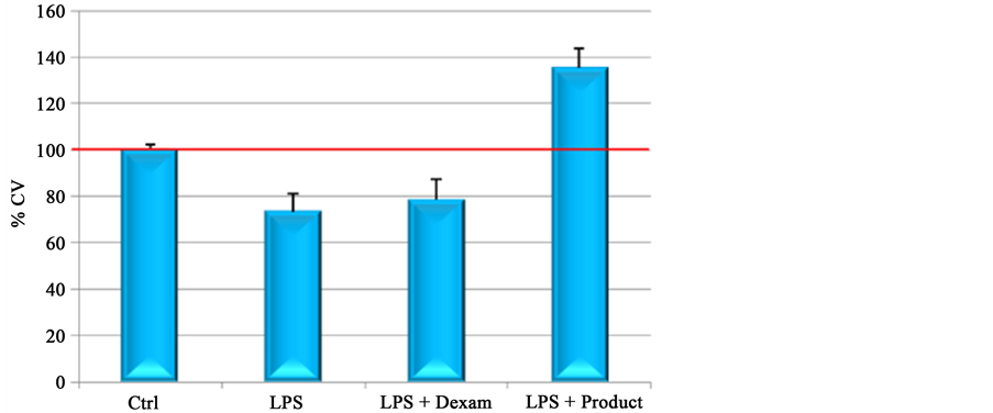 Figure 2. Cell viability (% CV). Ctrl, untreated tissues; LPS, positive control of inflammation; LPS + dexamethasone, positive control of anti-inflammation; LPS + Product (“ATOPIC SKIN BODY CREAM EXTREME”). Product- treated sample shows an increase in cell viability of about 35% respecting un- treated tissues.