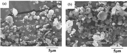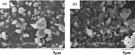 Figure 3. SEM images of the particles with the different content of lipophilic surfactant. (a) 3 wt%, (b) 10 wt%.