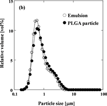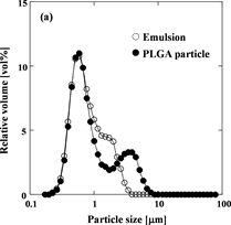 Figure 2. Size distribution of emulsions before the solvent evaporation process and prepared PLGA particles. Emulsion type used in particle preparation: (a) W/O/W emulsion; (b) S/O/W emulsion.