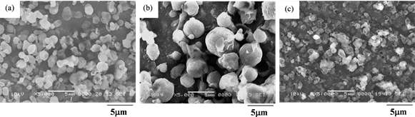 Figure 4. SEM images of the particles prepared with the emulsions containing different hydrophilic surfactants. Surfactant: (a) PVA; (b) L-1695; (c) Cholic acid.