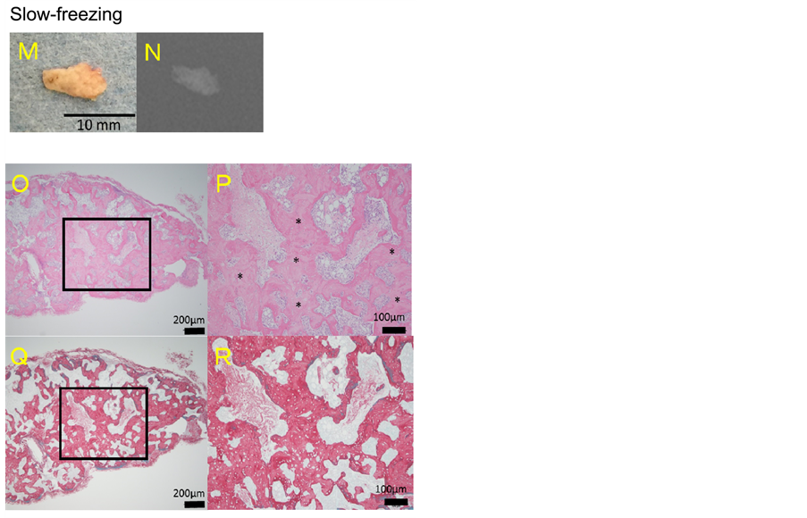 Osteogenesis of rapid- and slow-freezing OMCSs was compared to that of fresh OMCSs. OMCSs obtained from anentire 10-cm dish were collected into 500 μL standard culture medium in a 1-mL syringe (JMS Co. Ltd.; Tokyo, Japan), and then injected into a subcutaneous site on the backs of F344 rats (n = 12) using a 16-G needle (Terumo; Tokyo, Japan). Thawed OMCSs were transplanted immediately without culturing. Four weeks after injection, all samples were harvested and fixed in 10% neutral buffer formalin for 2 days. X-ray images of each sample were then obtained. Next, samples were decalcified in K-CX solution (Falma Co.; Tokyo, Japan), embedded in paraffin, and cut in parallel down the middle prior to hematoxylin and eosin (H&E) and Sirius red staining.