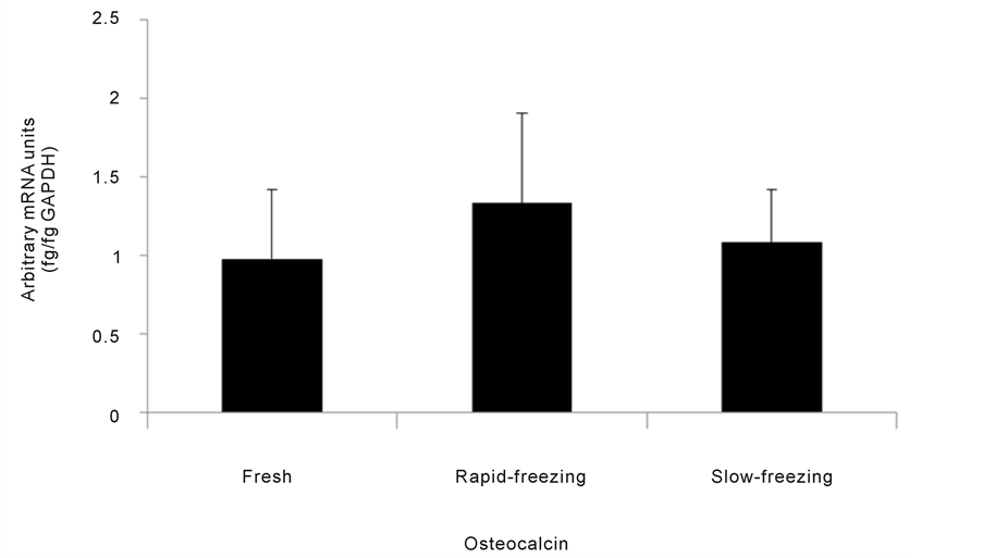 Osteocalcin expression levels evaluated by real-time PCR are shown in Figure 4. Osteocalcin expression level was 0.97 ± 0.44, 1.33 ± 0.57 and 1.08 ± 0.34 in fresh, rapid-freezing and slow-freezing groups, respectively. There was no significant difference in osteocalcin expression among the fresh, rapid-freezing, and slow-freezing groups.