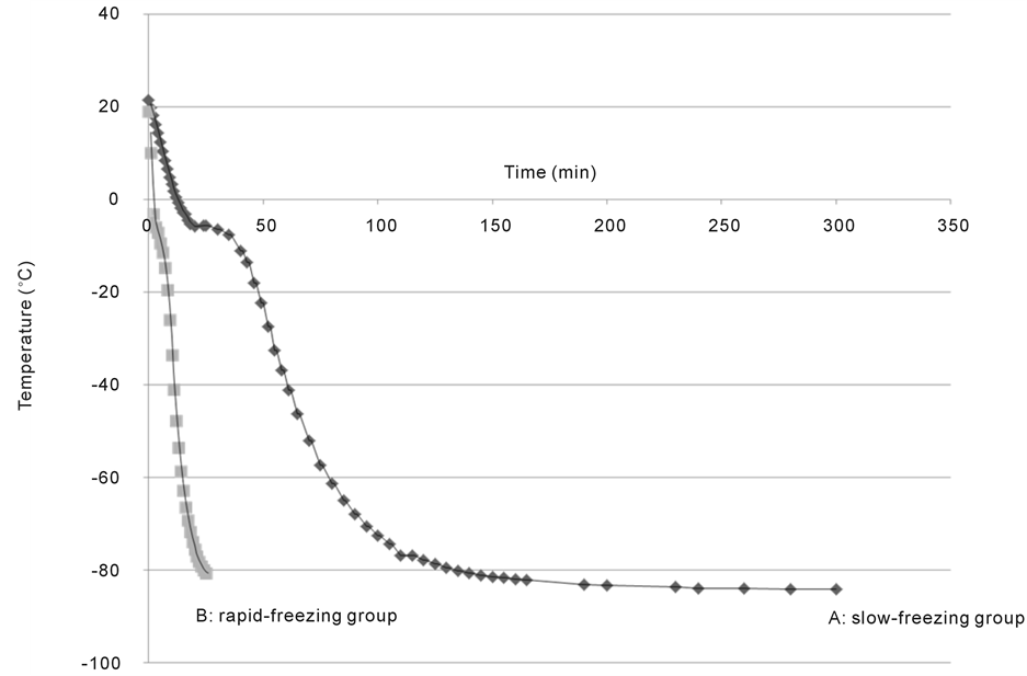 Representative temperature changes in the rapid- and slow-freezing groups are shown in Figure 1. In the slow-freezing group, almost 3 h was required for cryopreservation from 0˚C to −80˚C. In contrast, in the rapid-