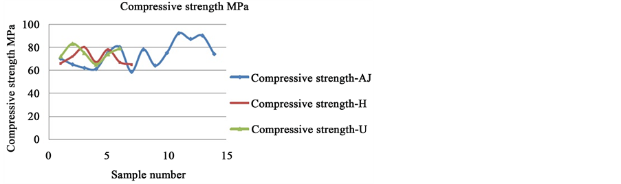 Compressive strength in(Mpa) results of the investigated samples from different spots are shown in Figure 5.