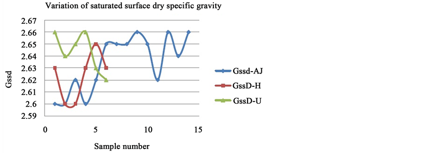The results fall between 2.6 and 2.66. Variation of results is noticed for the three granite sources due to their minor variation in their mineralogical composition. The results are shown in Figure 3.