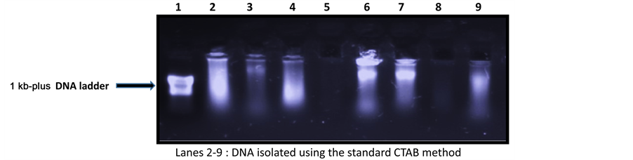 Figure 1. Agarose gel electrophoresis of DNA isolated from the 125 samples using the standard CTAB method.