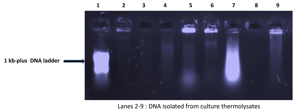 Figure 2. A typical agarose gel after electrophoretic analysis of thermolysate DNA.