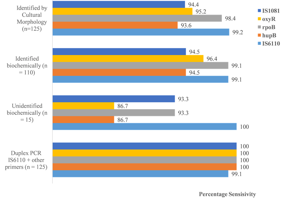 tion sites for rifampicin resistance, the intra-species variation of MTBC rpoB sequences was reported to be less than 1%. The sequence is thus highly conserved [16] . One of the two samples that gave a negative result with this assay was also negative in the biochemical tests, while the other was positive for all the other PCR assays. Thus, when all the assays were limited to samples that were positive by both the culture and biochemical tests, the sensitivity of the rpoB-based assay was equal to that of the IS6110 assay (99.1%). Additionally, the rpoB test was able to detect what the IS6110 test could not detect. The former test could therefore be a good substitute or preferably, a complement to the IS6110 test. The IS1081-based assay was the least sensitive. In one study using infected human blood samples, the sensitivity of the IS1081 PCR assay was only 43.75% [9] . However, when the latter assay was applied in the identification of M. bovis culture isolates, it identified 27 out of 27 (100%) of the isolates [17] . This indicates that although the assay was not very sensitive in the present study, it could nonetheless be a sensitive assay in the detection of M. bovis. The IS1081 gene is also known to exist in multiple copies in the MTBC genomes. On the other hand, the hupB and oxyR genes have been shown in previous studies to have sensitivities and specificities of 100% each, in the detection of MTBC strains [10] [11] . The combination of the IS6110 assay, which turned out to be the most sensitive, and each of the other assays gave 100% sensitivity (Figure 3). This strategy is preferable since genetic variants are possible.