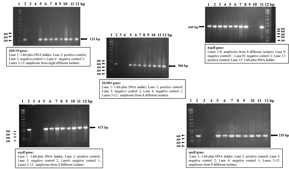 No size polymorphisms were observed for all the PCR products and all the sizes obtained were as expected for each of the assays: 123bp for IS6110, 645bp for hupB, 473bp for oxyR, 235bp for rpoB and 306 bp for IS1081. Figure 4 typifies the PCR results obtained with the different PCR assays. The lone isolate that was negative by the IS6110 assay was positive in the biochemical tests, while the lone isolate that was negative by the catalase test at 22˚C was positive in all the PCR assays. No single isolate was negative by all the PCR assays.