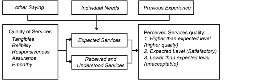 The quality of services is the most important factor in the success of any organization, as the survival of each organization in a highly competitive environment depends on its ability to offer high-quality services (Al Bassam & Al Shawi, 2011) . Moreover, the user’s satisfaction level of services is assessed through comparing the initial expectations of service quality and their actual quality. Thus, the satisfaction is clearly related with the quality of service (Krivobokova, 2009) . In fact, satisfaction feeling about services is influenced by such factors as people’s previous experience, personal needs and experiences of others. These factors determine the gap between user’s expectations and perceptions of the provided services (Akbaba, 2006) . In this regard, assessment of satisfaction level of rural residents about project implementation and the quality of services provided by the Housing Foundation is an important way to improve its performance in the process of rural development planning in the context of regional and zonal planning. Since improving the quality of project implementation and services provided by the Housing Foundation in terms of land preparation and spatial planning approach is impossible without considering the perspectives, demands and expectations of rural residents, it is necessary to use proper tools to understand the perspective of rural residents and their satisfaction about the constructional services. A proper and efficient tool is “SERVQUAL” tool (Parasuraman et al., 1988) . The research conducted by Parasuraman, Zeithamel, and Berry in 1988 led to the development of this tool, which is a combination of quality and service terms, measuring the gap between the customers’ expectations and perceptions and the services provided.