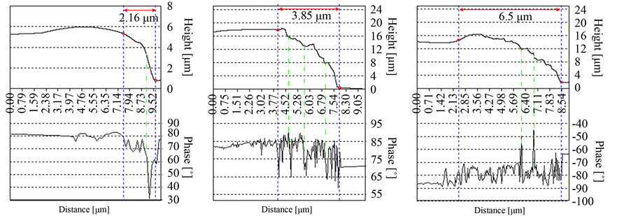 Finally, for the sample 3, starting from the left part of the image, the height profile presented a constant height value, at about 13.8 μm, which lasted to a distance of 2.13 μm. Then an increment to about 14.68 μm of height started at about 2.46 μm of distance (orange and red color). This is what we considered to be the Si substrate. The profile remained for a while around 16 μm and then decreased with a logarithmic alike behavior (yellow and green colors) for all over a distance of 5.49 μm and until a value near 1.75 μm of height, at 8.52 μm of distance. From here a constant value remained all over the right side of the image (blue contrast). Regarding the phase signal of the sample 3, the image started to the left part (blue contrast), corresponding to values near −85˚, Figure 5(f). At 1.41 μm of distance, a pick to −75˚ was observed, then returning to −85˚, followed by a decrement to around −90˚ at 2.11 μm of distance. Two picks are then presented, one to −7.7˚ at 2.46 μm and the other to −71˚ at 2.7 μm (green and blue colors). After that, values around −75˚ with intermittent fallen to −80˚ were presented until a distance of about 6 μm (green, blue, yellow colors). Then a sharp pick to −45˚ with a subsequent fallen to −80˚ followed by another pick to −50˚ and a consecutive fallen to −75˚ were presented. The phase went down to −85˚ with jumps to −70˚ and fallen phases to −80˚ (green, yellow, blue, hard-orange colors) until a constant value of around −63.61˚ at 8.61 μm of distance. At this phase value the signal was maintained until the end of the profile, at the right part of the image (hard-orange color).