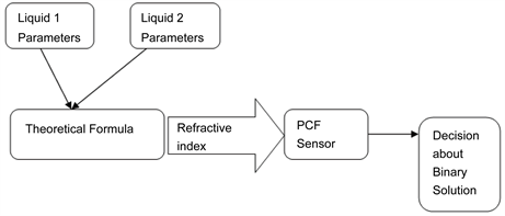 The composition of binary liquid mixtures can be determined by refractive indices measurements since the refractive index is the function of the composition of binary mixtures [19] [20] . The articles [21] [22] [23] describe the estimation of refractive indices of some binary mixtures and their mixing properties. To determine the refractive index of binary liquid mixtures the most extensively used methods are Arago-Biot [24] , Lorentz-Lorentz [25] , Weiner [26] , Heller [27] and Gladstone-Dale [28] . We can use any above mentioned relationship in the theoretical formula of our proposed simple block diagram of smart detection procedure of binary mixture through the refractive index values, which has been presented in Figure 1. The equations have been expressed in following: