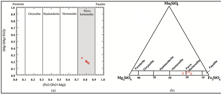 Figure 6. (a) Determination of the olivine types in the basic volcanic rocks of the study area. (b) Triangle diagram of Mn2SiO4-Mg2SiO4-Fe2SiO4.