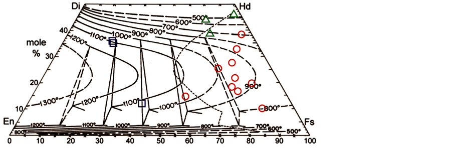 Figure 7. Wo-En-Fs diagram of clinopyroxene to estimate temperature [18] .