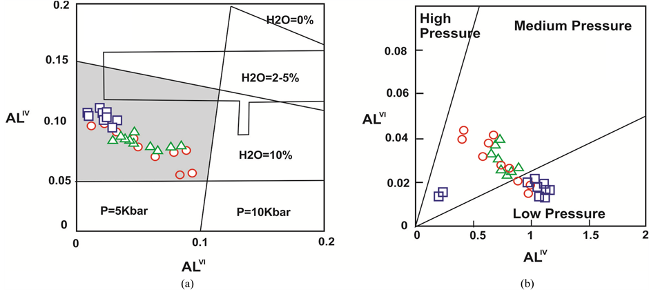 Figure 8. (a) Clinopyroxene barometry diagram from [19] . (b) Clinopyroxenebarometry and hydrometry diagram from [20] .