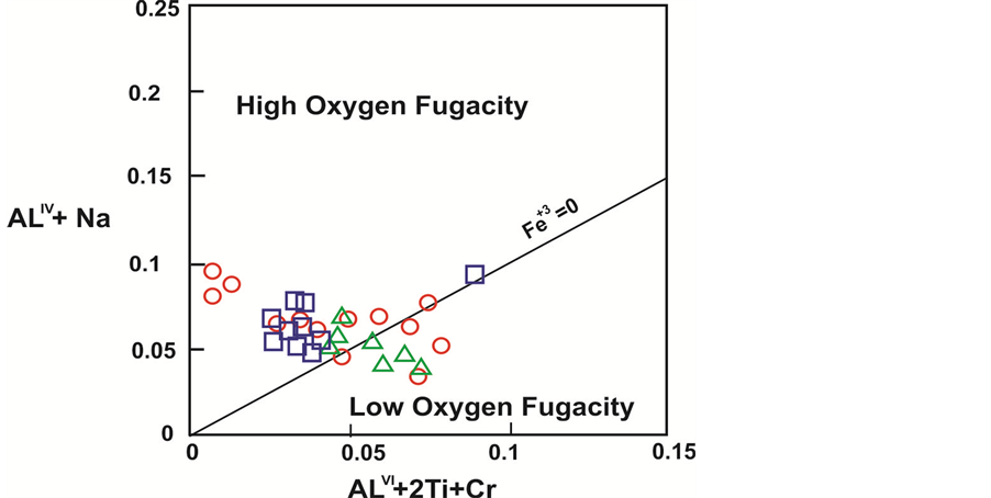 Oxygen fugacity plays an important role in changing of the liquidus temperature, melt and crystals composition, magmatic processes controlling, crystallization sequence and types of crystallized minerals [21] -[24] . Using AlIV + Na vs AlIV + 2Ti + Cr diagram which depend on the amount of 3-valent iron in pyroxenes, we can get oxygen fugacity. The diagram is set based on the aluminum balance in the tetrahedral position with Cr3+ in the octahedral position. The Fe3+ in pyroxenes can be displaced 3-valence elements such as AlVI, Ti and Cr in the octahedral position. In the other hand Fe3+ in pyroxenes depends on the amount of AlVI which means it depends on the aluminum balance in tetrahedral and octahedral position. Figure 9 show that the pyroxenes which crystalized at high oxygen fugacity, has been situated above the line of Fe3+. Furthermore, Papike and Cameron [25] have mentioned to the distances of the samples from the Fe3+ line and noted that further distances of the samples from this line are indicating more oxygen frugalities in their geological setting. In this diagram some samples are located above the line of Fe3+ line and some are below that (Figure 9).