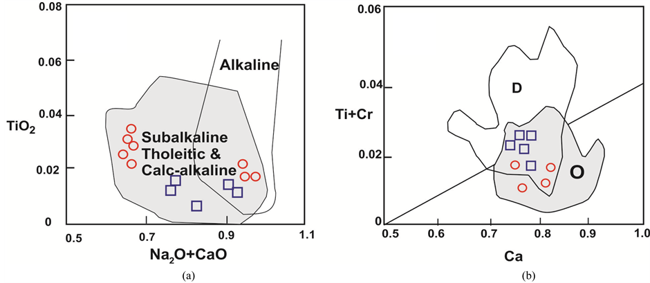 Pyroxene composition depends on the chemical composition and tectonic setting of the host lava which can be used widely to determine geological setting of the rocks [27] [28] . Ti + Cr vs Ca and TiO2 vs Na2O + CaO diagrams define the pyroxenes which generated by tholeiitic and calc-alkaline magmas from those of alkaline. Plotting data on Ti + Cr vs Ca and TiO2 vs Na2O + CaO diagrams shows that the samples are subalkaline to alkaline tendency. Diagrams (Figure 10) indicate the extensional setting of the area when the rocks were formed.